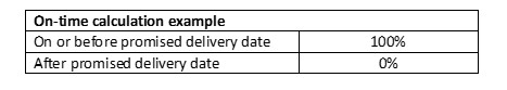 - Supply Chain On-time (SCOT): This measurement is a comparison of the “Promised Delivery Date” and “Received Date” mentioned on every purchase order line item. Any item which is received at Amway after the promised delivery date will be considered as late and will yield 0% score. Every line item mentioned in the purchased order will yield either 0% or 100% score, final score will be the simple average of all the line items received.