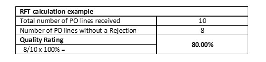 - Right First Time (RFT) Score: This measurement is quality score for the material received at a line-item level in a purchase order. Every line item in the purchase order will have a score, final score will be the simple average of all the line items received.